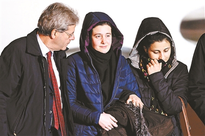 两名在叙利亚阿勒颇做救援工作的女志愿者2014年遭叙利亚武装分子绑架。她们于近日被释放。图为1月15日,两人抵达意大利罗马机场。对于她们如何被释放及绑架人相关信息,意大利政府未作出任何解释。供图/CFP