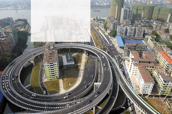 洲头咀隧道18日11时通车,图中海珠段的洪德立交施工难度非常大