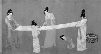 图为《织色入史笺》一书中插画,唐代张萱《捣练图》(局部)。