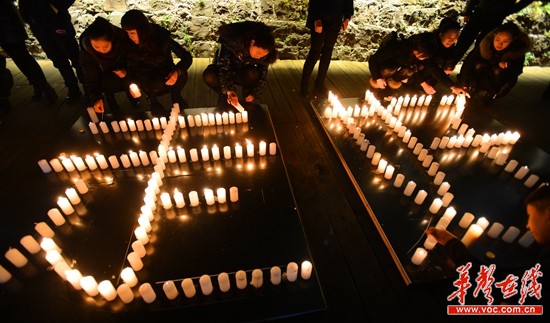 “清晨,你披一袭轻纱,柔柔地唤醒了凤凰。傍晚,你穿一身霓裳,暖暖地照亮凤凰。你从苗岭深处走来,一湾秀水牵动爱的山岗,吊脚楼的传说在你的碧波里荡漾,那些浪漫的月亮小船在你的浪花里歌唱……”1月20日晚,湖南凤凰古城的沱江边,1000多名游客在江畔上点起蜡烛,齐唱歌曲《唱给沱江》,追悼著名青年歌手姚贝娜并为她祈福。2008年,刚获得第十三届CCTV青年歌手电视大奖赛流行唱法金奖,姚贝娜就应邀倾情演唱了《唱给沱江》。这首歌还在凤凰古城取景,拍摄了MTV。湖南日报记者 徐行 摄