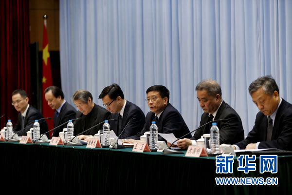 1月21日,“12·31”外滩拥挤踩踏事件联合调查组成员、上海市应急办主任熊新光(右三)在新闻发布会现场发言。当日,上海公布“12·31”外滩拥挤踩踏事件的调查报告,认定这是一起对群众性活动预防准备不足、现场管理不力、应对处置不当而引发的拥挤踩踏并造成重大伤亡和严重后果的公共安全责任事件。黄浦区政府和相关部门对这起事件负有不可推卸的责任。新华社记者 丁汀 摄