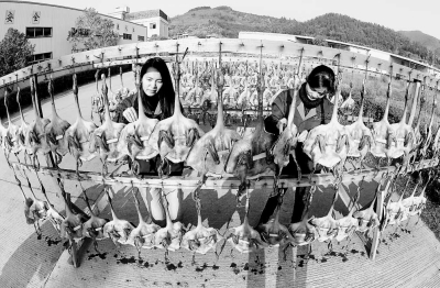 19日,福建省建瓯市盛州食品有限公司的员工在晾晒传统风味板鸭。
