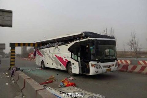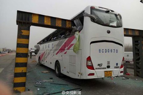 1月26日中午12时许,一辆核载59名乘客,由河南省开往天津的长途大客车(牌照为豫CD0670),在途经津霸公路王庆坨路段时,与限高杆相撞。