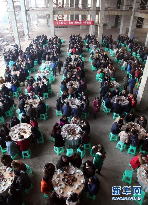 1月27日,四川省华蓥市一家建筑企业的600余名农民工品尝“坝坝宴”。当日是农历腊月初八“腊八节”,四川省华蓥市一家建筑企业在工地上摆下60余桌“坝坝宴”,宴请忙碌了一年的600余名农民工,在团聚中庆祝“腊八节”。新华社发(游青 摄)
