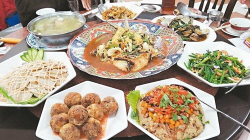 佳里红屋顶海产店推出台南传统料理虱目鱼五柳枝等菜色,满满一桌菜仅新台币1000余元。(图:台湾《联合报》/记者谢进盛 摄影)
