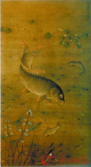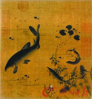 历史上画鱼的名家很多:据记载,五代后唐时,有袁羲善画鱼,能“穷其变态”;宋时有徐白、徐泉、徐易等人专门画鱼,元、明、清三代也都有以画鱼而著称的画家。不过梁江介绍说,早期有关鱼的绘画流传下来的比较少,花鸟画在宋代才受到重视,成为成熟、独立的门类,“宋徽宗时编撰的《宣和画谱》将中国的绘画题材分为十门,鱼龙名列其中,可见宋代皇室对鱼的喜爱。”宋代因此不乏传世的画鱼名作,其中刘寀最为著名,其长卷《落花游鱼图》,以工笔设色的方式描绘水中游鱼,或成群穿波,或横流而过,水上花叶缤纷,水下藻荇飘荡,呈现出宋画如诗的境界。在本次展览中的《群鱼戏荇图》也被认为是深得刘寀风格的作品。另外,展出的宋代马和之《清泉鸣鹤》则以写意法,简单数笔即描绘了小鱼群嬉戏游玩的活泼姿态。