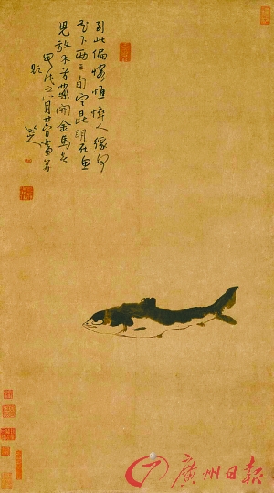 可以说,在画鱼时,艺术家普遍强调一个“活”字,《芥子园画传》中的“画鱼诀”提到:“画鱼须活泼,得其游泳象。见影如欲惊,噞喁意闲放。浮沉荇藻间,清流姿荡漾。悠然羡其乐,与人同意况。若不得其神,只徒肖其状。虽写溪涧中,不异砧俎上。”强调画鱼要画出鱼在水中悠然自若,否则就与砧板上的食材无异。如展出的清代华喦《群鱼戏藻图》,图中群鱼在水草中自在游弋,最大的鲇鱼先以淡墨圈定轮廓,再用色、墨交互敷染,呈现水彩画般淋漓的效果,加上极具动态的触须,足见功力非凡。