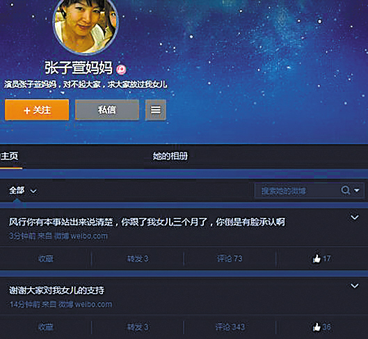1月28日,名为“张子萱妈妈”的账号发声挺女儿与陈赫,并称:“他们早在一起了,我和子萱她爸早就知道,@张子萱 @陈赫 他们是我的好孩子,求大家放过他们,谢谢大家。”该账号的真实性尚未核实,不排除存在网友恶搞的可能性。陈赫爸妈的冒名微博也出现。据悉,陈赫妈妈真实微博是“天乐小屋”,名为“胡小玲-陈赫妈妈”的账号则系网友恶搞。![]()