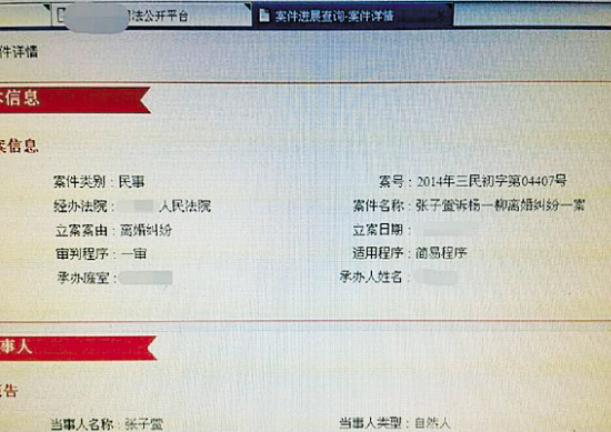 承认与陈赫恋情的同时,张子萱还发了一张与丈夫杨一柳打离婚官司的信息截图。很快,一名名为“为打酱油而经过”的技术控网友就根据照片显示的该案案号,推算出起诉时间。该网友称,在中国裁判文书网可以查到2013年以后的案件信息,截图中的“2014年三民初字第04407号”中,2014年是立案的年份,“三”是法院的文书简称,“民”代表是民事案件,“初”是指一审。在中国裁判文书网上查找到的以三民初字为文书名的法院不多,网友推断该案是在河北三河法院审理的。