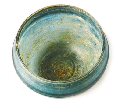 1987年,在广西合浦县文昌塔70号汉墓出土了一件“弦纹玻璃杯”(见上图),现藏于广西壮族自治区博物馆。此杯高5.5厘米、口径7.3厘米、底径4厘米,经压模成型后,精细抛光,呈半透浅蓝,敛口,弧腹,自腰下内收,小平底,腹部饰三道弦纹,保存完整。合浦县位于广西壮族自治区南端、北部湾东北岸,县城周围68平方公里范围内,地下留存汉墓数万余座,是我国沿海最大的汉墓群。合浦县境内发掘的数百座汉墓中,已发现89座汉墓有玻璃制品,出土的玻璃器种类相当丰富,有杯、碗、盘、璧、珠、环、管、耳珰、鼻塞、龟形器等。
