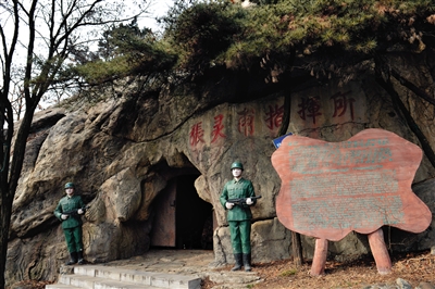 景区里立着张道宇和母亲王玉玲2007年在景区的合影,用来吸引游客,旁边的石壁上,刻着“击毙张灵甫之地”七个字,石壁下面是不到1米高的缝隙。