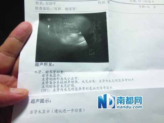 2012年12月,万润平在武汉几家医院的B超检查,结论都是“右肾未见显示”。