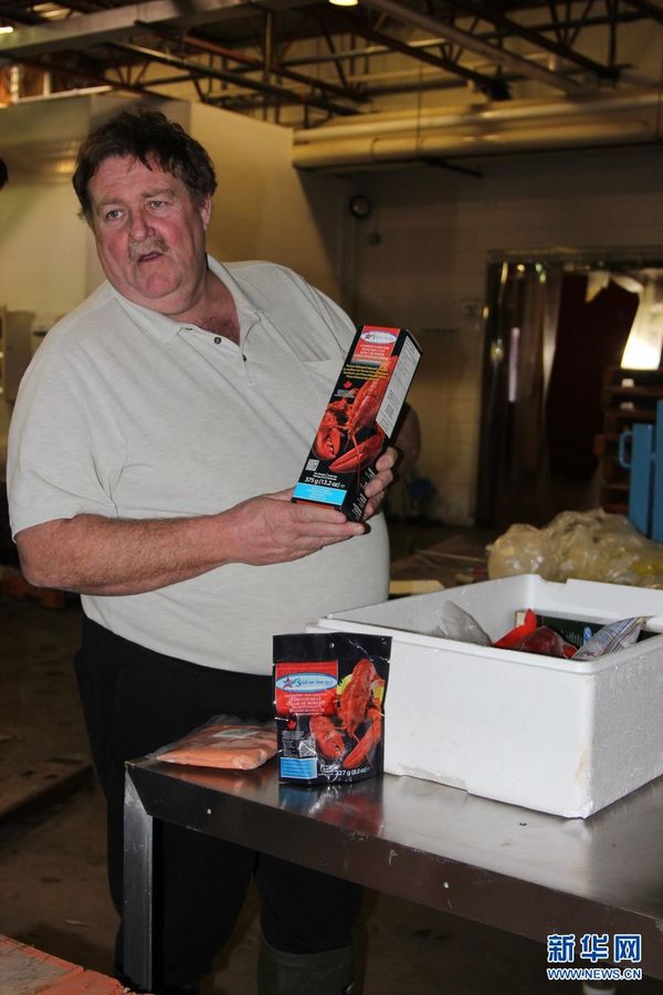 在加拿大爱德华王子岛省的当地知名水产公司皇家之星食品公司总经理弗兰西斯·莫里西向记者展示销往香港的冷冻龙虾食品。新华社记者晏忠华摄