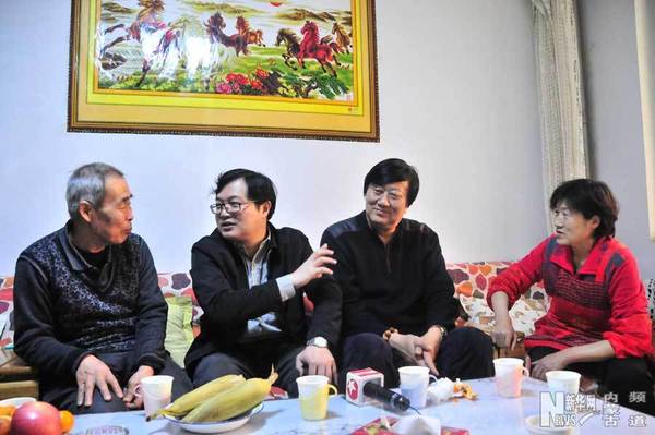 2月4日,正值立春。陈磊、汤计等推动呼格吉勒图案再审的新华社记者到呼格吉勒图父母家中慰问,与李三仁、尚爱云夫妇共迎新春。图为新华社内蒙古分社社长陈磊(左二)、新华社记者汤计(右二)与李三仁、尚爱云夫妇热情交谈。(康文魁 摄)