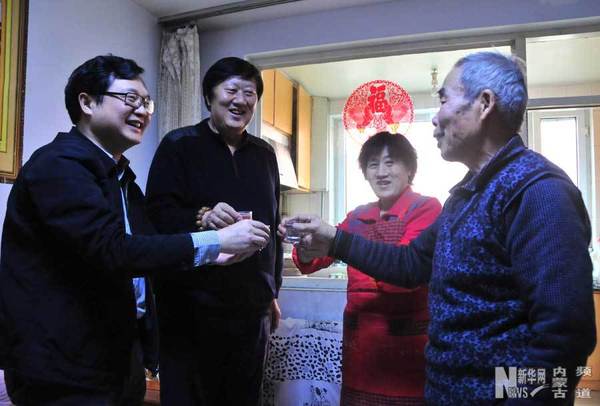 2月4日,正值立春。陈磊、汤计等推动呼格吉勒图案再审的新华社记者到呼格吉勒图父母家中慰问,与李三仁、尚爱云夫妇共迎新春。图为新华社内蒙古分社社长陈磊(左二)、新华社记者汤计(右二)与李三仁、尚爱云夫妇热情交谈。(康文魁 摄)