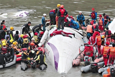 昨日下午,救援人员试图营救复兴航空坠河班机中的乘客和空乘人员。