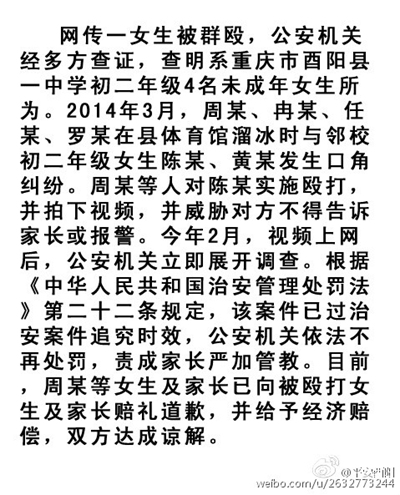 重庆酉阳县一中学女生被群殴,并配有视频。重庆市酉阳县公安局官方微博“@平安酉阳”今日通报称,该案件系去年3月酉阳县一中学初二年级4名未成年女生所为,并拍下了视频。