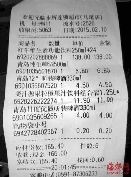 小票上显示红牛一箱(24罐)价格为138元