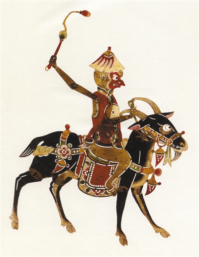 中国美术馆藏清皮影《猴骑羊》。