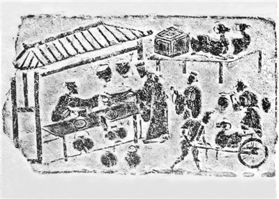 四川东汉画像砖《市中卖酒画像拓本》。