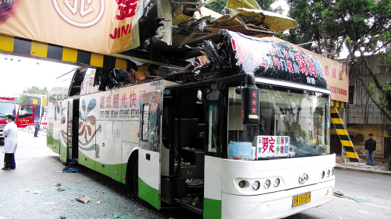 限高架将大客车的车头顶盖削掉了三分之一