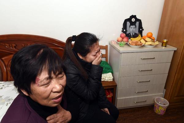 新华社照片,沈阳,2015年2月17日 记者手记:凌晨他倒在办公桌前——34岁民警殉职前的7天7夜 2月17日,袁哲的母亲(左)和妻子在家中伤心流泪。袁哲10年前以第一名的成绩考到沈阳市公安局和平分局,在太原派出所已经工作了5个年头,曾任三级警长和刑侦民警,多次立功受奖。因为参加全国公安部门的“禁毒会战”和春节安保工作。他一直吃住在单位,连续工作7天7夜。2月16日早晨7点左右,34岁的民警袁哲因连续超负荷工作突发心肌梗塞,因公殉职。新华社记者 杨青摄