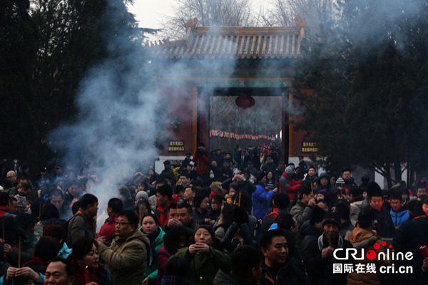 2015年2月19日,羊年大年初一,北京皇家寺院雍和宫内祈福敬香的市民人潮涌动。当日,雍和宫向每位入寺的市民免费发放“环保香”,将有效减少烟尘等污染物排放。每年正月初一,众多香客都会前往雍和宫敬香祈福。据了解,除夕夜晚上11时,雍和宫外已有二十余名香客排队等候,大家都希望一炷香能讨个好彩头。图片来源:宋家儒/CFP
