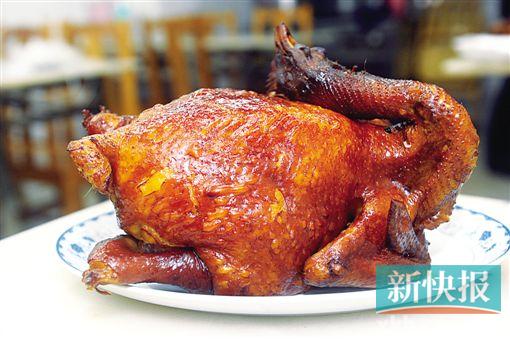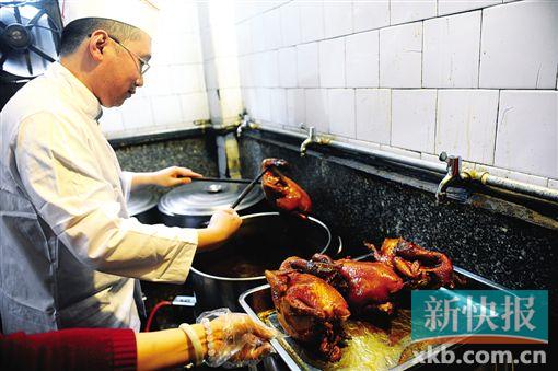 在制作厨房,新快报看到一锅精卤水微沸着。高崚先将宰好的光鸡逐一放进锅中浸泡,并用中火煮,约15分钟,使之均匀上色。那锅精卤水的配料有十多种,绝不外传,店方还与掌握关键程序的厨工签署保密协议。接着,浸熟的鸡放在盘架上晾约半小时。最后一道程序是烟熏,属于绝密环节,记者也无缘见识。