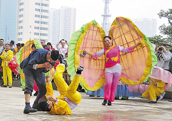 羊城晚报讯 记者张文、通讯员吴婷摄影报道:大年初一,地处粤北的千年古县韶关始兴,浓缩了当地客家和瑶族居民民间艺术特色的青草狮、龟蚌舞(见左图)、飘色、舞阿妹等表演在每年一度的新春巡游中轮番登场,将具有浓郁粤北地区特色的非物质文化遗产原汁原味地呈现在市民面前。