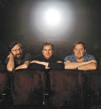 曾经的皮克斯三巨头:埃德·卡特穆尔、乔布斯(中)与拉塞特(右)。