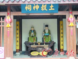 明代的土地祠,出现了土地夫人像。《古今图书集成·神异典》载,明正德年间顾公璘任台州知府时,发现有土地祠设土地夫人像,便说:“土地岂有夫人!”命下属将其像撤掉。社日常下雨,俗称“社翁雨”,《提要录》解释说:“社公社母,不食旧水,故社日必有雨,俗谓之社翁雨。”可见明以后民间已将社公和社母配成夫妇,同时祭祀这老两口。直到现在,很多土地庙里都摆放着两尊土地神像,左边是社公,右边是社母,神像两旁还经常贴着一副对联,上联是:“公公十分公道”,下联是:“婆婆一片婆心”。