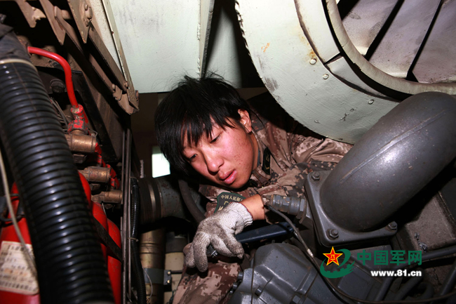 藏族女兵斯娜拉姆在检修装备。吴忠勇摄