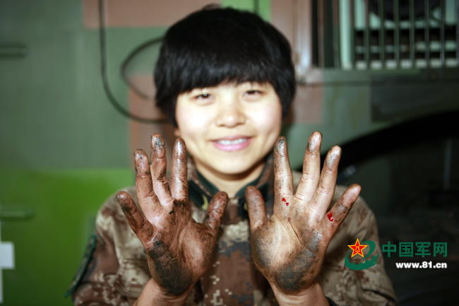 陈宇妍在维护装备时不慎划伤,她用微笑面对伤痛。吴忠勇摄