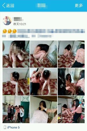 第二组的另外9张照片记录了被殴女生裸身被侮辱的一幕,图片上4名女生架住全身赤裸的被殴女生合影,同时还举起表示胜利的剪刀手。当事人发出这组照片时,还配上了3个笑脸鼓掌的表情。