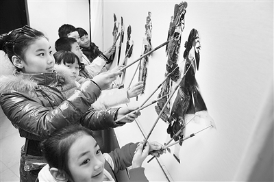 ②滦县龙山初级中学组建的“滦州神龙少儿皮影艺术团”的小演员们在排练皮影。