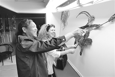 捷克皮影爱好者在张向东的示范下尝试操纵皮影。