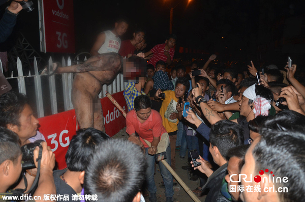 当地时间2015年3月5日,印度迪马布尔地区发生一起暴民冲击监狱事件,一名强奸嫌疑犯被绑架出监狱,并在遭裸体游街示众和殴打后被杀害。令人震惊的是该男子被杀害后,周围群众纷纷拿出手机拍摄。据悉,该男子名为Syed Farid Khan,他涉嫌强奸一名当地女学生。图片来源:东方ic