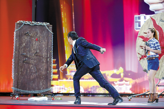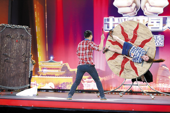 王勇和赵倩的飞刀表演不仅成功激起了范冰冰的女侠梦,也令周立波既紧张、又佩服。尽管意识到节目的危险性,周立波却没有因此退缩。就在范冰冰尝试飞刀失败后,周立波评委再也按捺不住内心的激动,也走上台去亲自尝试“飞刀钉木板”。在仔细询问了王勇发射飞刀的姿势、力度及距离等诸多要素后,周立波总算在一次练习时大获全胜,飞刀中靶,迎来了全场欢呼。然而周立波并没有就此满足,紧接着他又想像赵倩一样爬上转盘,并试图把自己固定在上面进行旋转。相比飞刀,上转盘的难度更大也更难成功,周立波费尽周折爬上转盘后却很难保持平衡,只得紧紧贴着盘面绷紧身体,累得他满头大汗。回到评委席后周立波依然兴奋不已:“最怕人的是那个转盘。太棒了师傅,承让承让,好刺激好刺激!”![]()