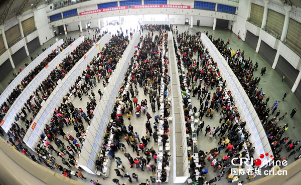 2015年03月07日,西安,“2015年春季大型免费综合类招聘会”在西安国际会展中心A馆举行,来自省内420多家企、事业单位提供涉及电子、保洁、酒店、餐饮、超市、医药、建筑等20多种行业的12000多个就业岗位,引来17000多人现场投递简历应聘。截至发稿时,现场达成用工意向5062人,报名参加培训的游74人,还有238人与创业示范单位达成创业意向。图片来源:袁景智/CFP