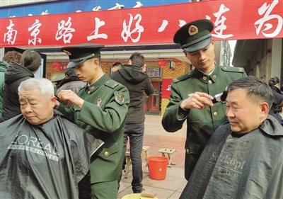◀3月7日,上海“南京路上好八连”战士在为群众义务理发。