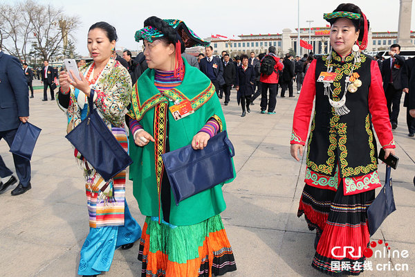 3月8日下午3时,第十二届全国人民代表大会第三次会议在人民大会堂举行第二次全体会议,听取全国人大常委会委员长张德江关于全国人民代表大会常务委员会工作的报告以及全国人大常委会副委员长李建国关于中华人民共和国立法法修正案草案的说明。恰逢“三八”妇女节,各民族“半边天”盛装出席,上演历年必现的节日“时装秀”。面对记者簇拥而来的镜头,她们挥手高呼:“节日快乐!” 摄影 姚毅婧