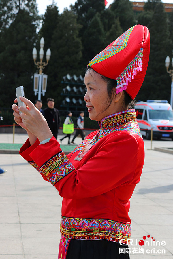 3月8日下午3时,第十二届全国人民代表大会第三次会议在人民大会堂举行第二次全体会议,听取全国人大常委会委员长张德江关于全国人民代表大会常务委员会工作的报告以及全国人大常委会副委员长李建国关于中华人民共和国立法法修正案草案的说明。恰逢“三八”妇女节,各民族“半边天”盛装出席,上演历年必现的节日“时装秀”。面对记者簇拥而来的镜头,她们挥手高呼:“节日快乐!” 摄影 姚毅婧