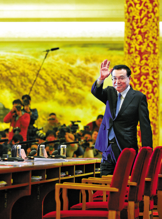 国务院总理李克强步进人民大会堂金色大厅,微笑着向大家挥手致意