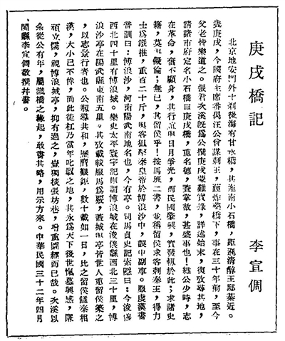 1943年4月4日张江裁上书伪北京市政府,请将甘水桥小石桥易名为“庚戌桥”。呈文曰: