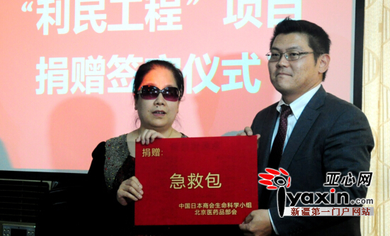 3月16日下午4时,乌市克拉玛依西路自治区残联会议室,盲人协会会长陈莉红(左)接受日本国驻华大使馆一等秘书官西川昌登赠送的“急救包”捐赠牌。亚心网记者史纪伸实习生谢鹏