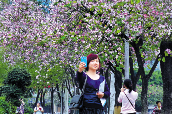 回南天渐渐远去,羊城迎来了一年赏花季。位于人民北路的紫荆花如期而至,引来不少市民围观拍照。前日,到了晚上还有三三两两年轻人拿着相机来拍紫荆花,其中一年轻人说,他下班赶来已经是傍晚了,“虽然错过了白天,但晚上拍紫荆也别有一番趣味。”从每年2月中旬起,人民北路两旁的紫荆花便依时绽放,连绵不断的紫荆花为蜿蜒的人民北路铺上了一条粉红彩带,偶尔缕缕春风吹过,花絮飘然而落。“其实今年人民北的紫荆花并没有往年那么好,那种飘絮的感觉还不是很够。”全职妈妈骆女士是一位几乎每天都在广州大街小巷里“寻花”的“赏花达人”,在跟记者电话聊天时,她正在中山纪念堂一带拍木棉花,“今年这里的木棉花挺漂亮的。”