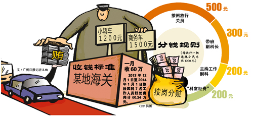 他们的收钱标准是:小汽车每车次人民币1200元,大车(如商务车等容量较大的车辆)每车次1500元。然后再由各组组长将好处费分发给科室相关工作人员。