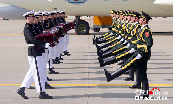 中方礼兵护送烈士遗骸登上中国人民解放军空军接运专机(摄影 安光浩)