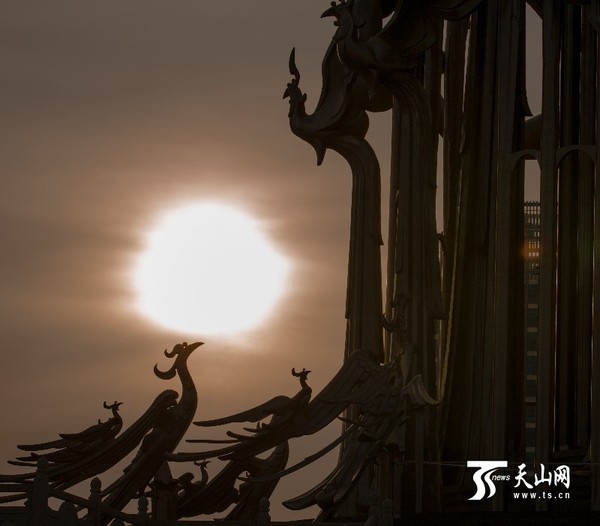 天山网讯(通讯员杨童榆摄影报道)得知3月20日北疆地区可以一睹“天狗吞日”的壮观天象,专门来到克拉玛依地标“凤凰涅槃”下,见证日食时“凤凰涅槃”天体交错瞬间,可惜“天狗”只是轻轻咬了一口,就“撤离”了。前后不到半小时,笔者用镜头记录了这次日偏食。