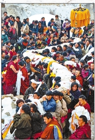 风雪中抬佛像的年轻信众